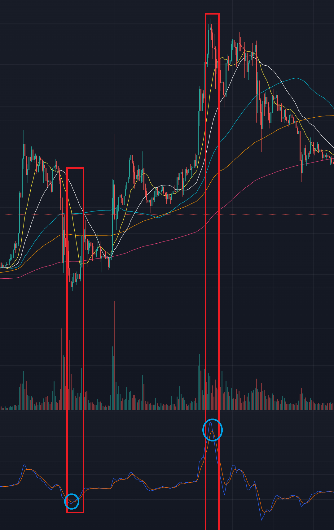 흰색 점선 아래에서 MACD와 시그널선이 상향교차(골든크로스) 후 큰 상승을
