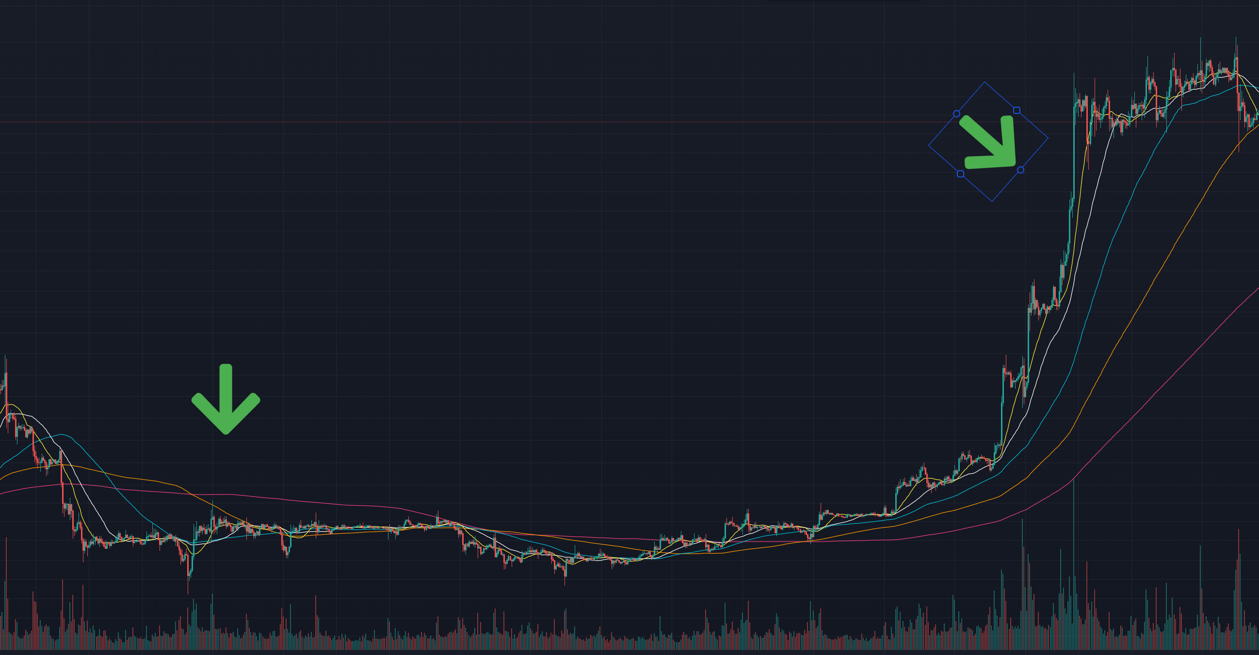 이동평균선이 모이면서 횡보를 하다가 발산하면서 급격히 상승하는 모습이 보이시나요?