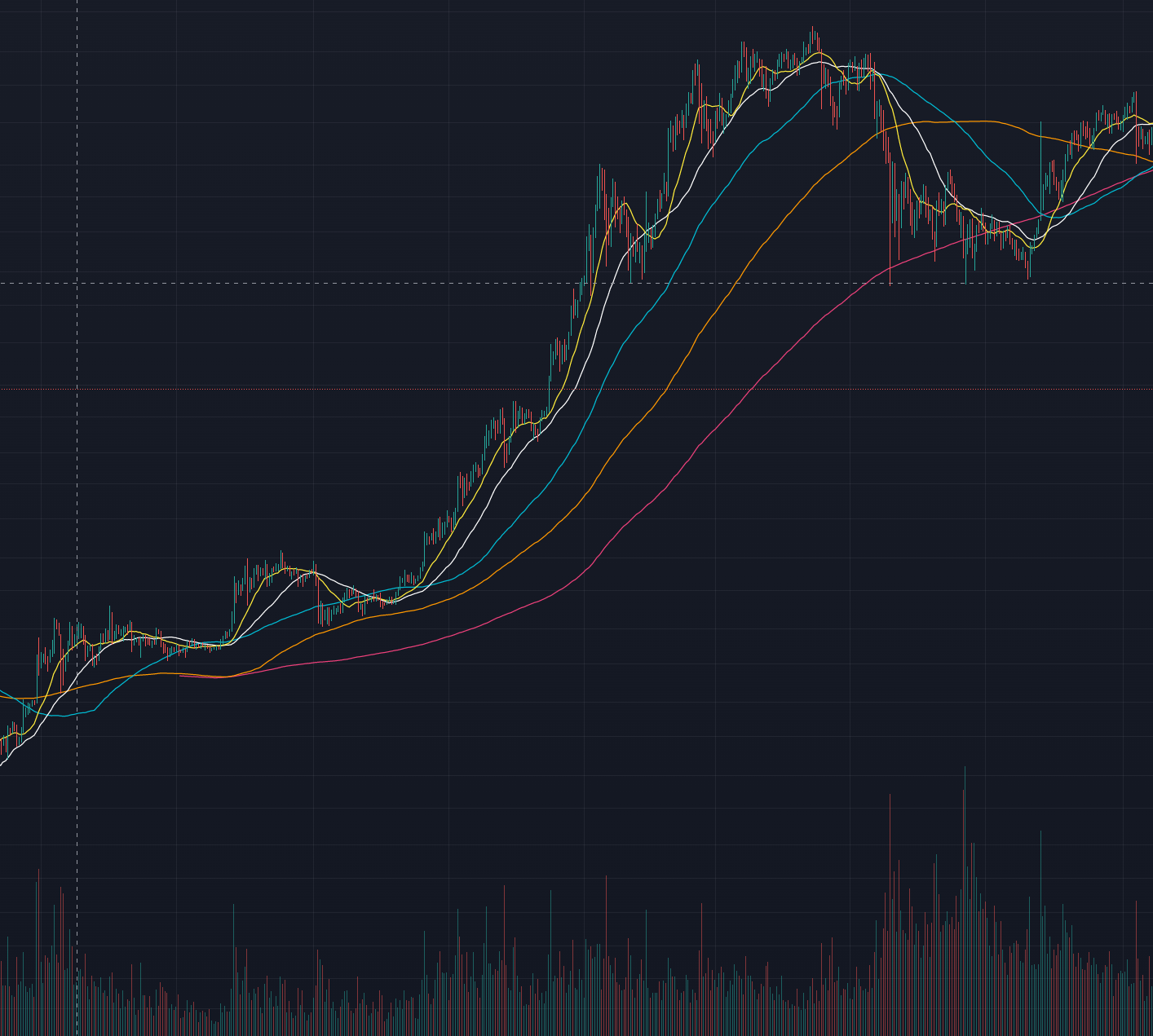 이런 상황에서 흰색선 밑으로 선이 내려오면 하락추세라기 보단, 조정이라고 볼 수 있습니다.