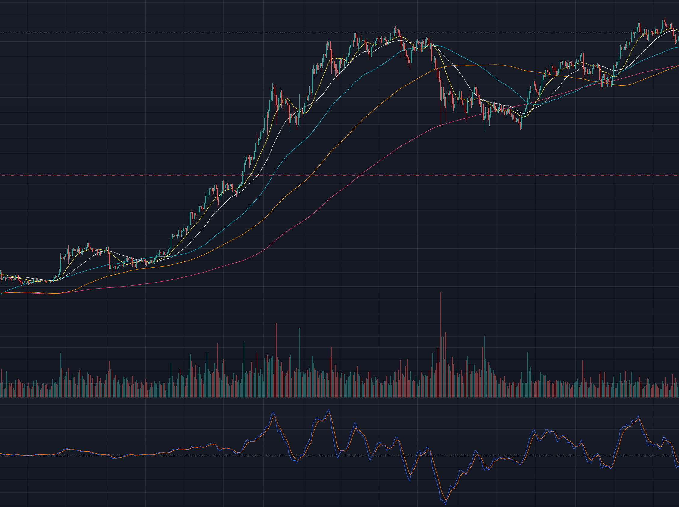 흰색 점선위에 MACD선과 시그널선이 위치해 있는 경우가 많다면 상승 추세 입니다.