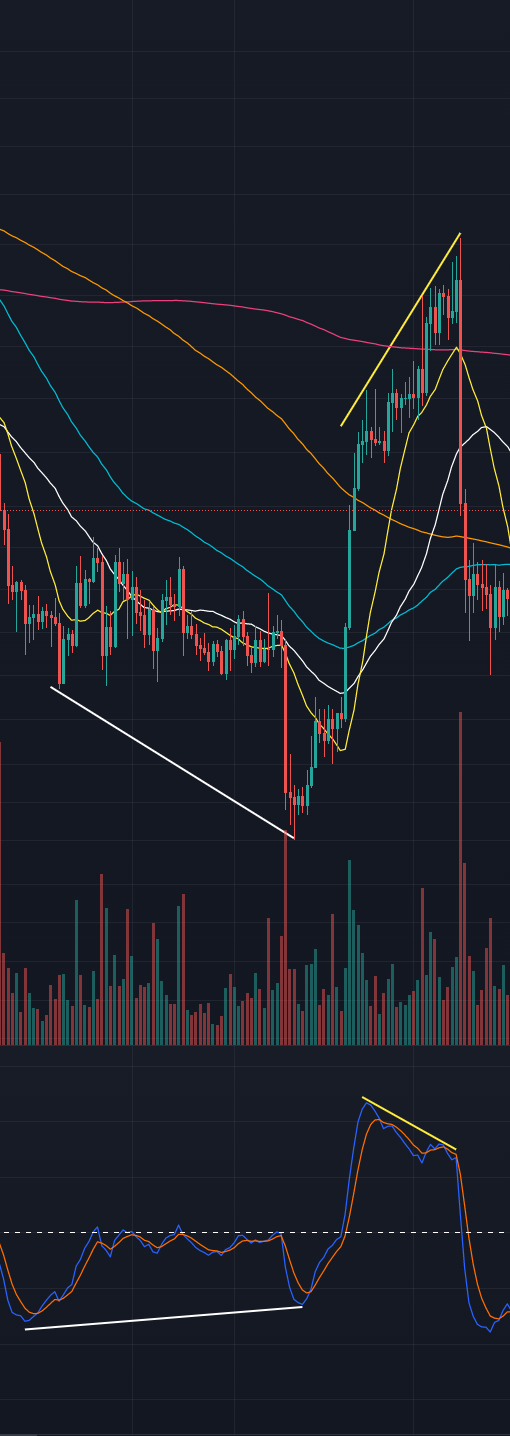 이어서, 캔들 차트의 노란선을 보시면 고점이 높아지고 있으나, MACD 고점은 낮아지고 있고