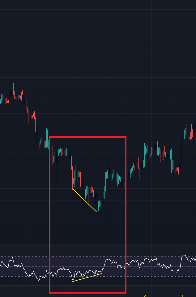 (대표 예: 캔들이 작아지며, 지표의 다이버전스(괴리현상)가 발생될 경우)