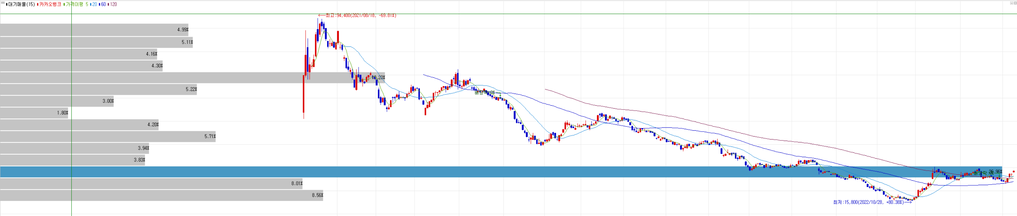 그렇지 않고, 캔들이 해당 매물대 아래에 있으면 강력한 저항구간이 되어 상승을 방해하는 구간이 되겠습니다.